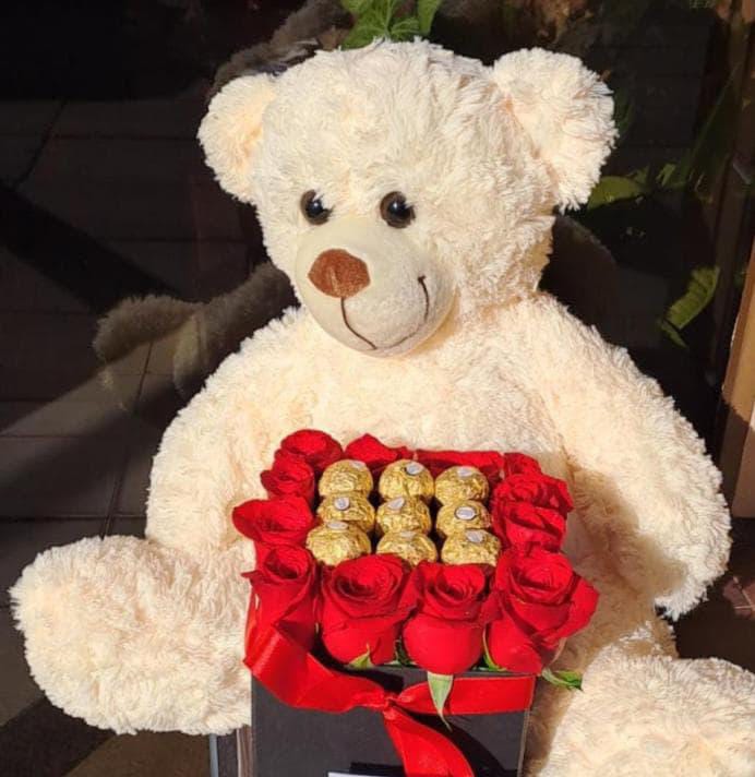 Super box de rosas importadas y ferrero rocher. Junto a un Osito de peluche de 50 cm.
