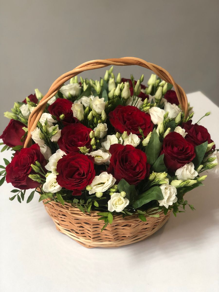 Arreglo floral en canasta de mimbre. Contiene una docena de rosas importadas, follaje y lisiantus.
