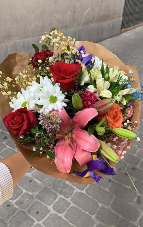 Ramo con variedad de colores y formas. Incluye rosas liliums, alstromelias y flores de estacion.