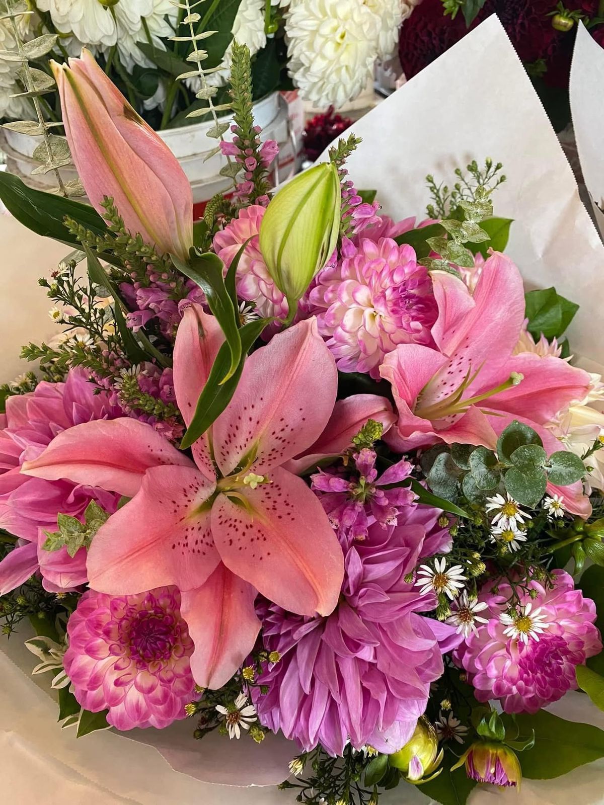 Liliums, alelies follaje y crisantemos, en este ramo en colores rosa y purpura.