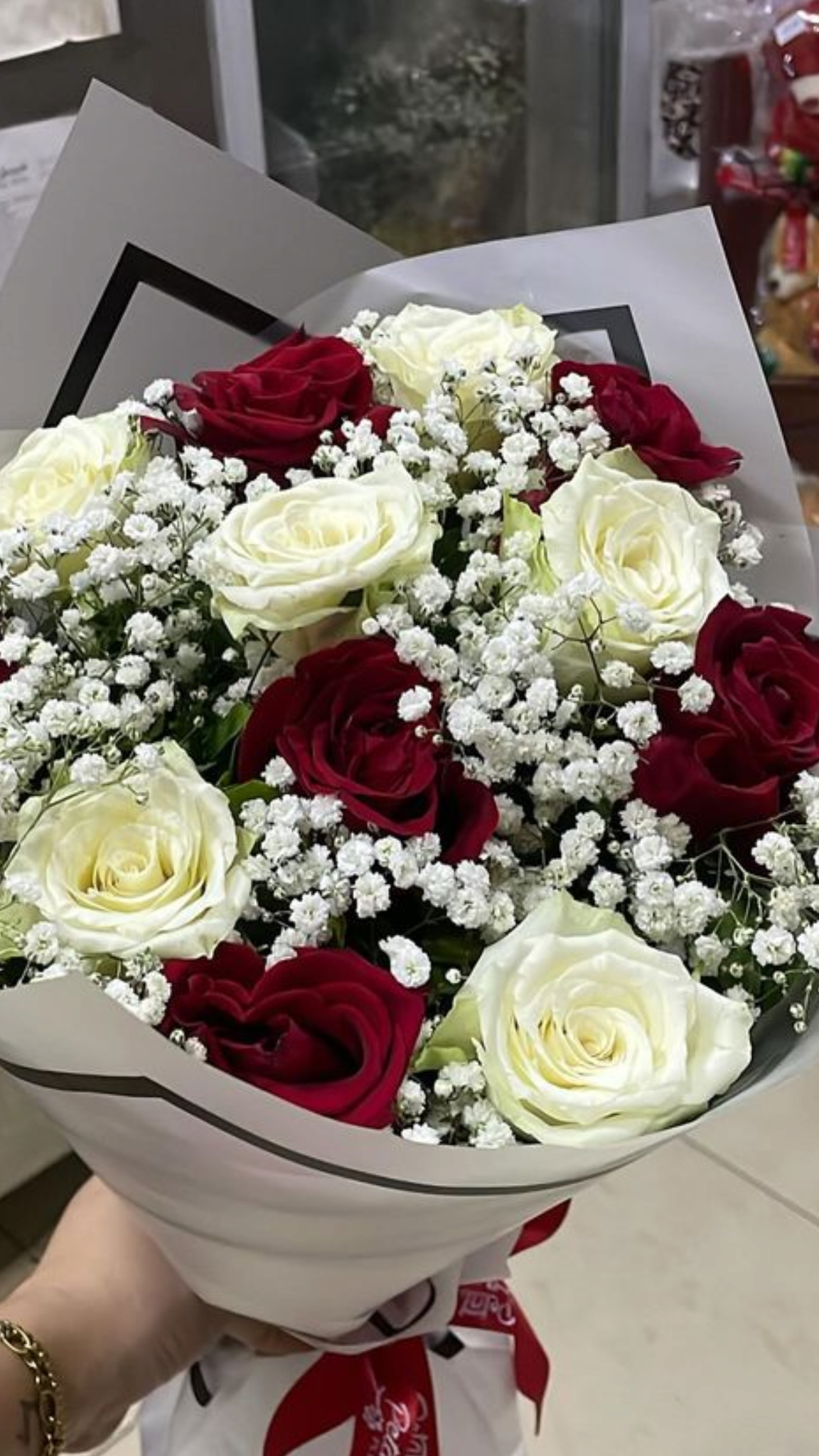 Docena de rosas Bicolor. Follaje y gypsophilias.